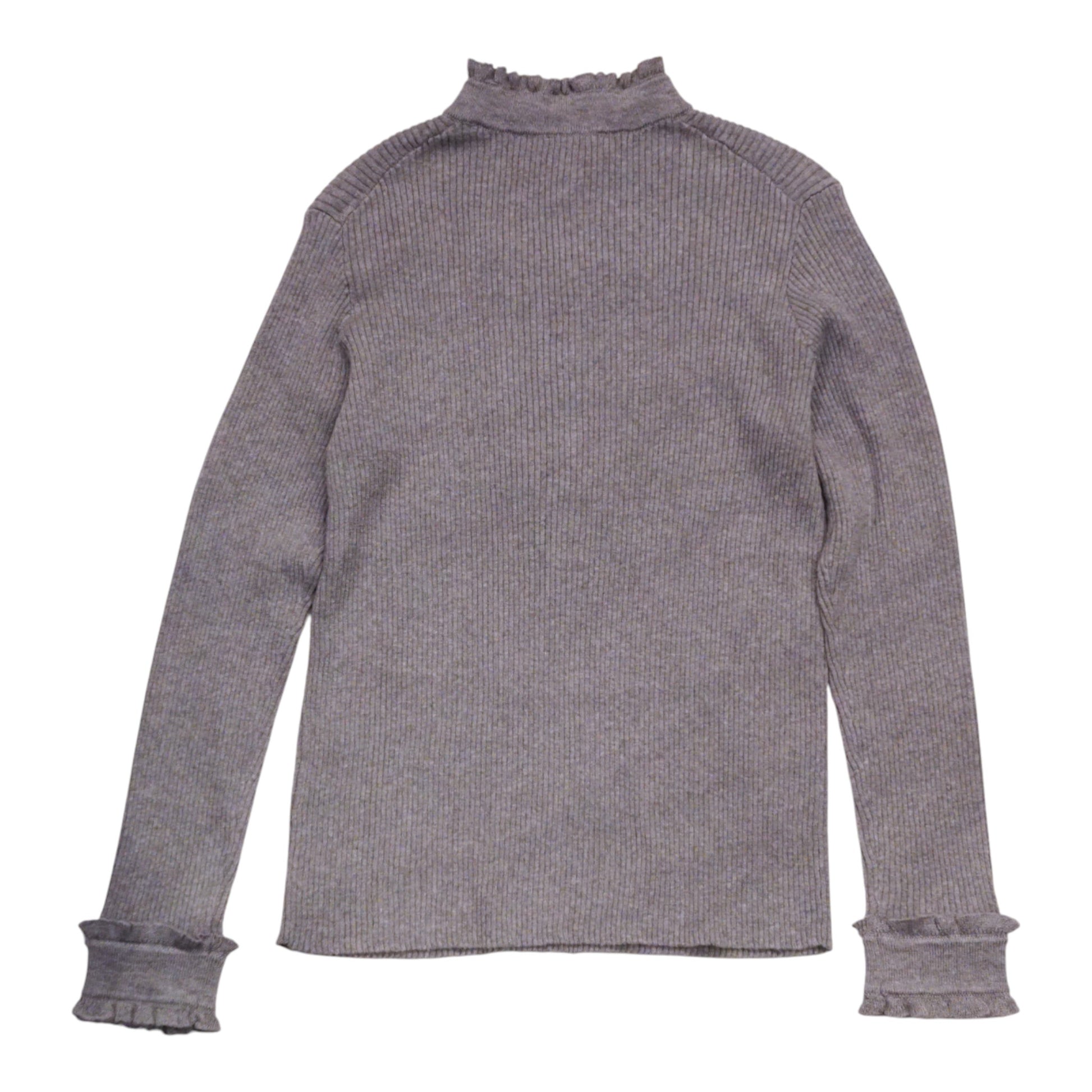 全体に施されたリブ編みが、ボディラインを美しく見せ、スタイルアップ効果も期待できます。前身頃、襟元、袖口に上品にあしらわれたフリルは、甘すぎず、大人の女性にふさわしい優雅さを演出します。フロントのマットゴールドのボタンが、さりげないアクセントとなり、クラシックな魅力を引き立てます。