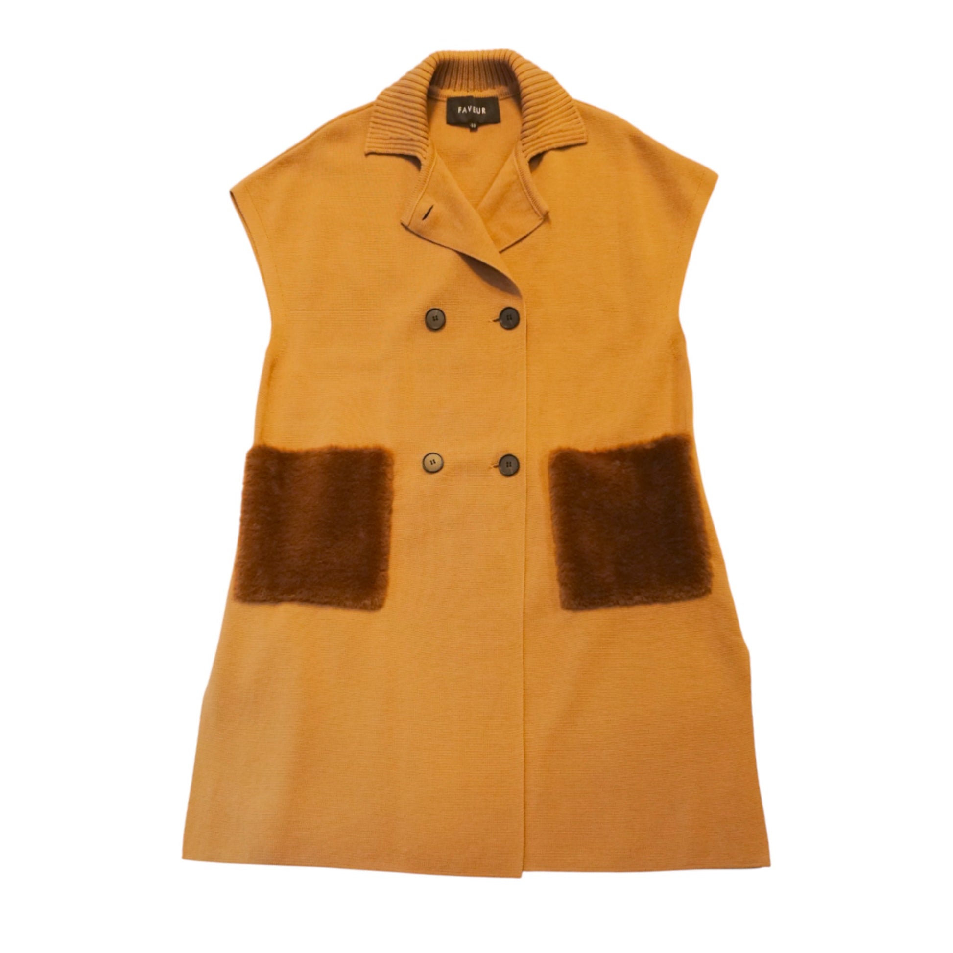 クラシックなダブルブレストのデザインと、ミニマルなキャップスリーブが、洗練された大人の雰囲気を演出。両サイドにあしらわれた、ふわふわのエコファーポケットが、可愛らしいアクセントになっています。