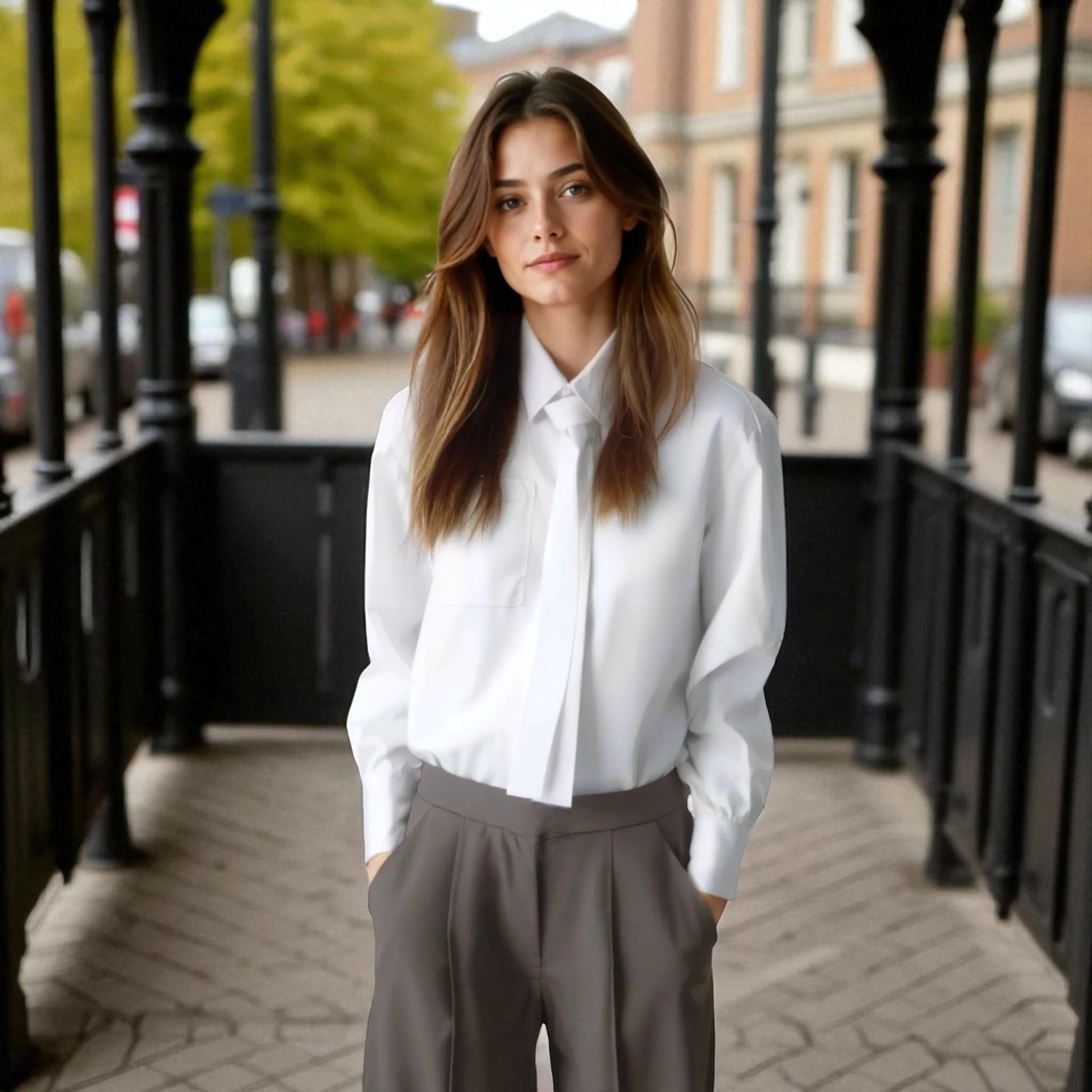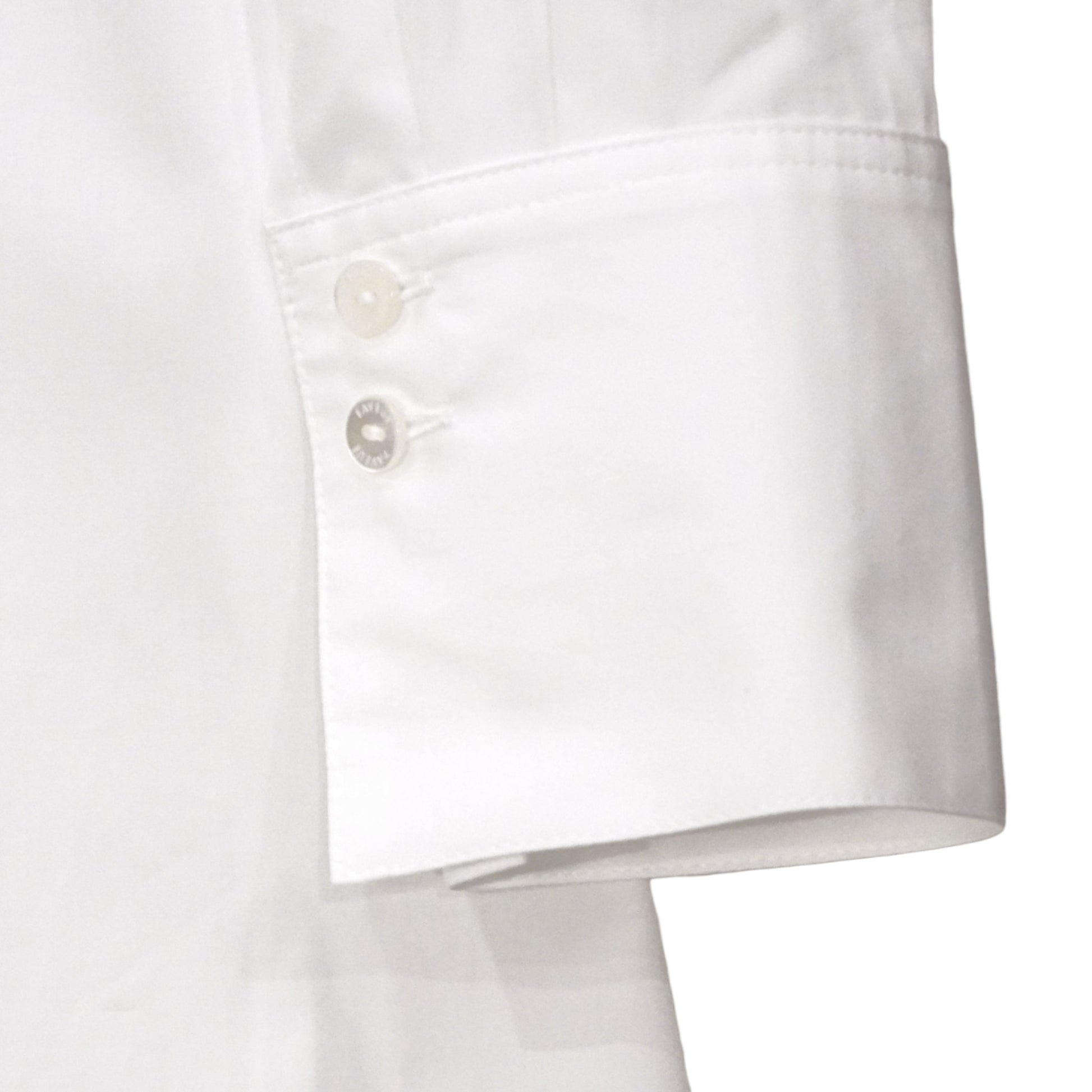 最高級の綿花を厳選し、熟練の職人が織り上げる生地は、シルクのような光沢と滑らかな肌触り、そして優れた耐久性を誇ります。その品質の高さから、世界中の名だたるハイブランドやテーラーに採用され、**「シャツの最高峰」**として知られています。このブラウスは、その特別な生地を贅沢に使用して作られています。