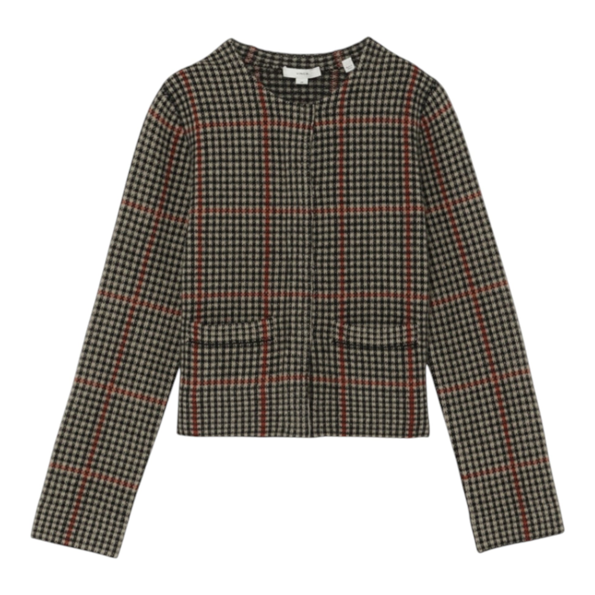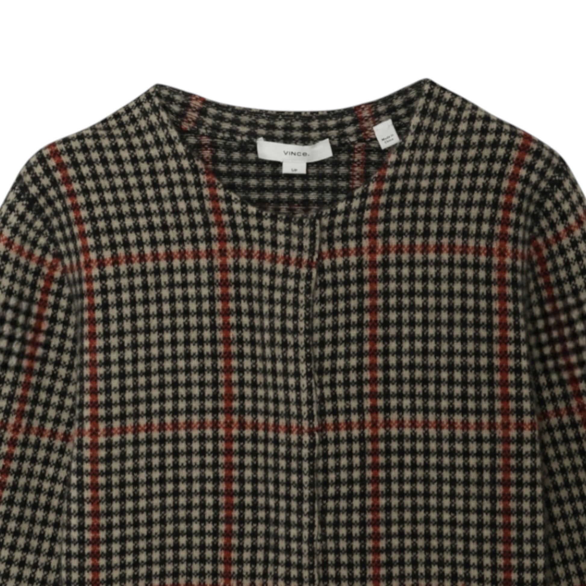 クラシックなグレンチェックをモダンなニットで表現した、**VINCE.**のニットジャケット。上質な素材とテーラードのような品格が、あなたのスタイルをワンランク上に引き上げます。