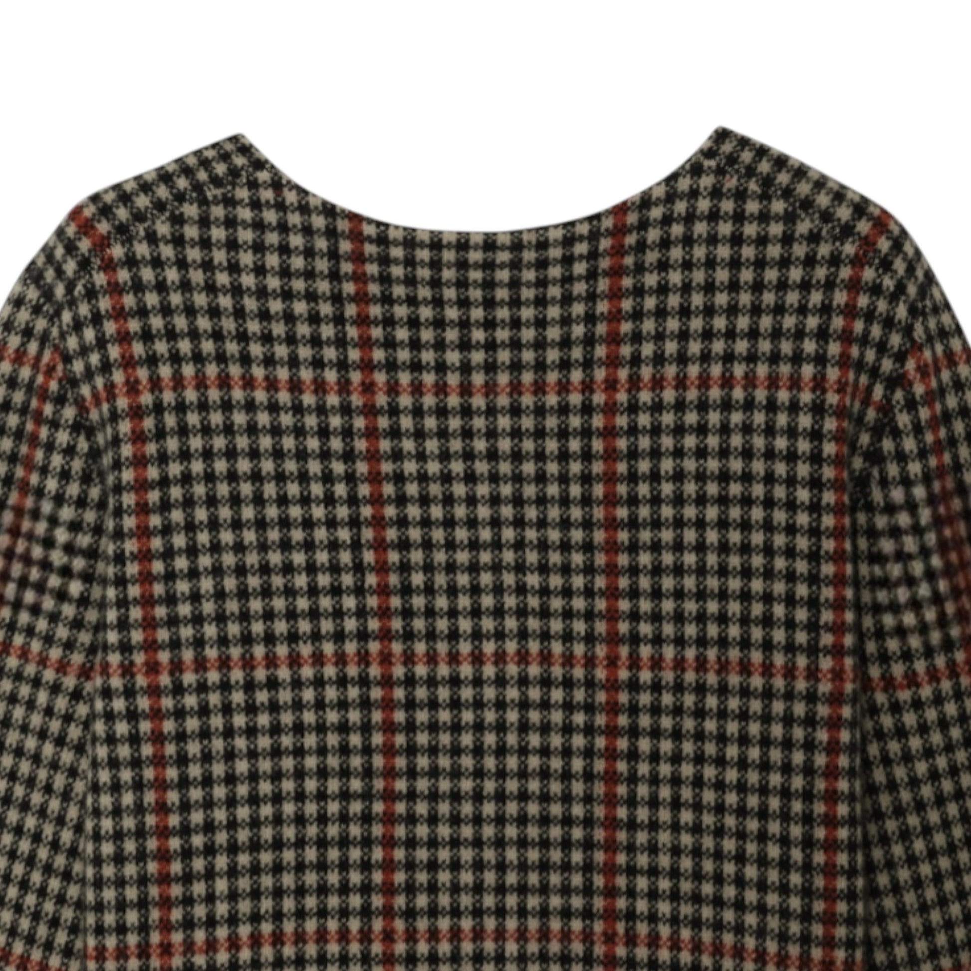 贅沢にブレンドされたウール70%とカシミヤ30%の生地は、柔らかく滑らかな肌触りでありながら、程よいハリ感を持ち、美しいシルエットを保ちます。熟練の技術が光るインターシャ編みによって、クラシックなグレンチェック柄を現代的に表現しました。