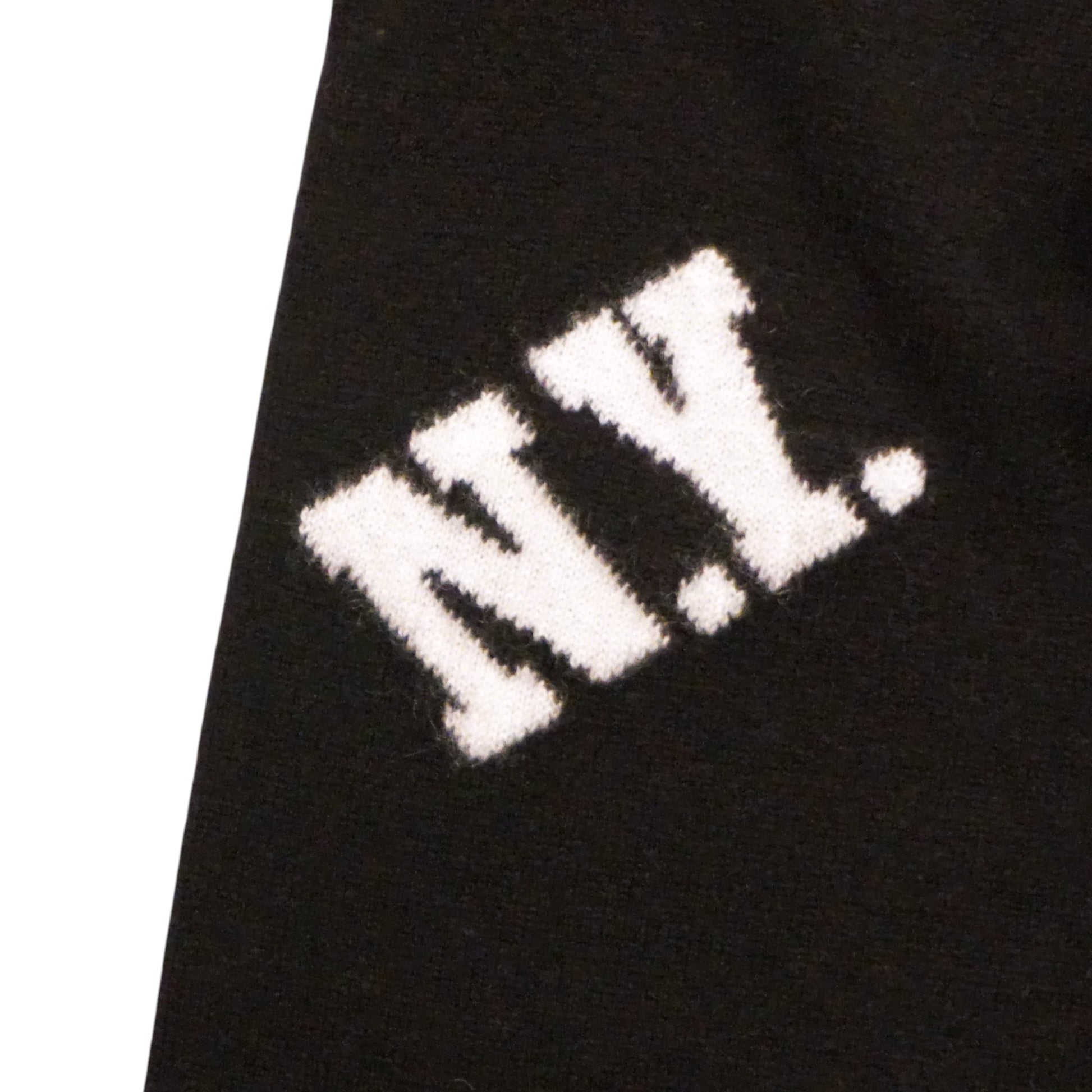 ボディはシックなブラック。そこにNYや57thといった遊び心のある文字を、インターシャという高度な技術を用いて織り込んでいます。プリントではないため、カシミヤの風合いを損なうことなく、立体感と洗練された印象を与えます。