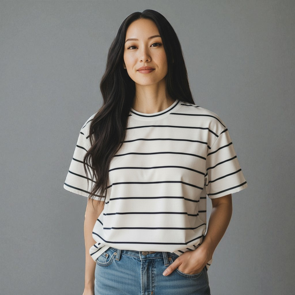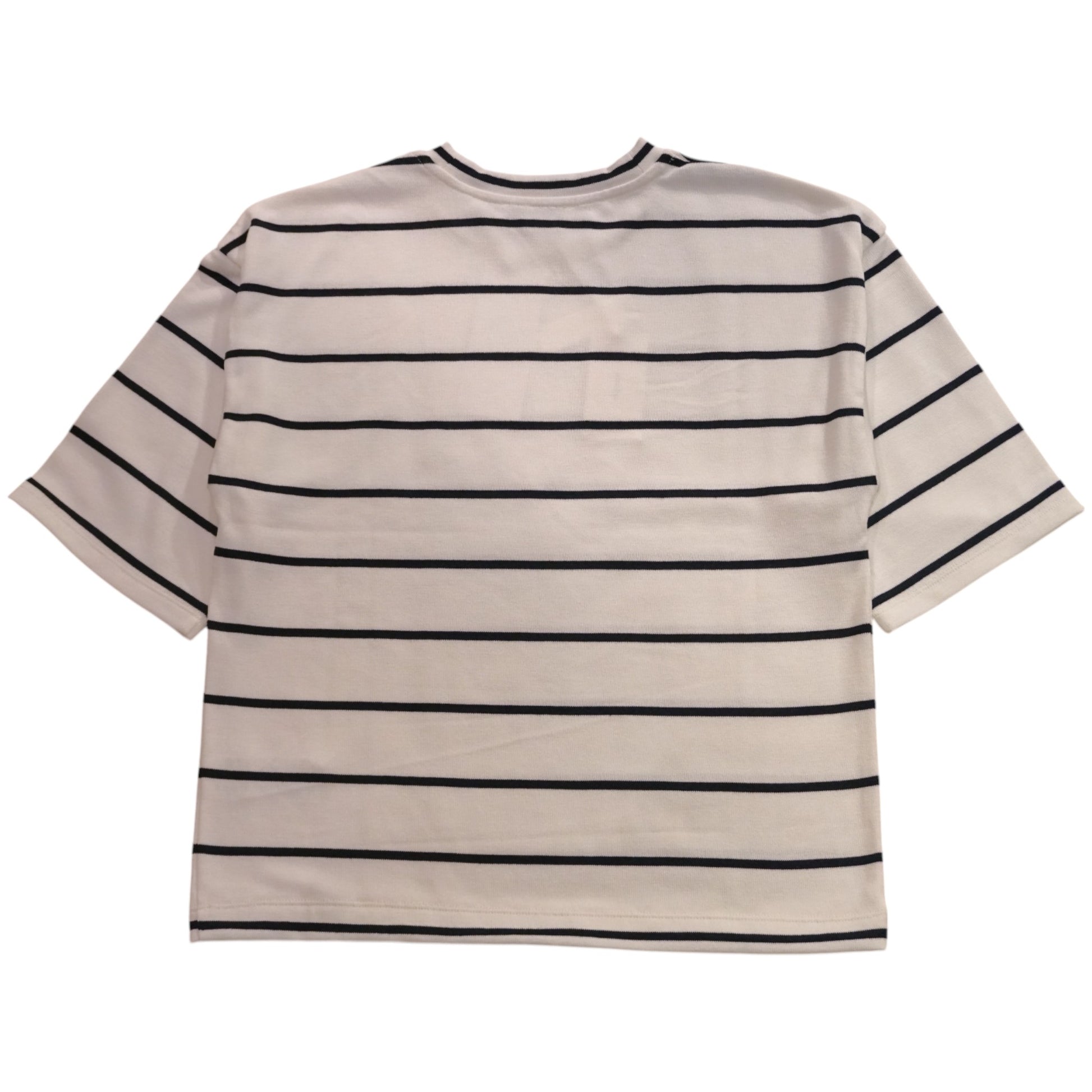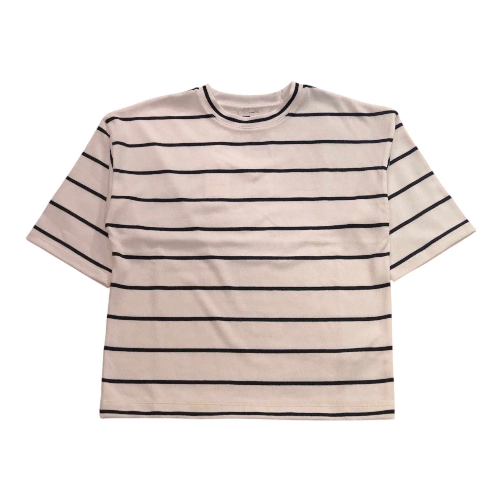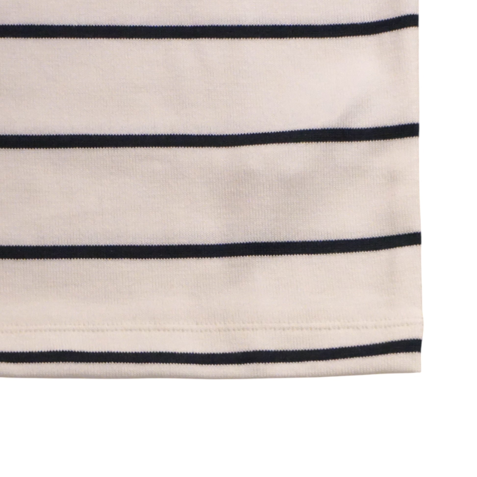 ポリエステルとレーヨンを主としたブレンド素材を使用しており、軽くて柔らかい着心地が魅力。Tシャツとは一味違う、なめらかな肌触りを楽しむことができます。白地に黒の横縞をあしらったクラシックなデザインは、どんなボトムスとも相性が良く、着回し力も抜群です。