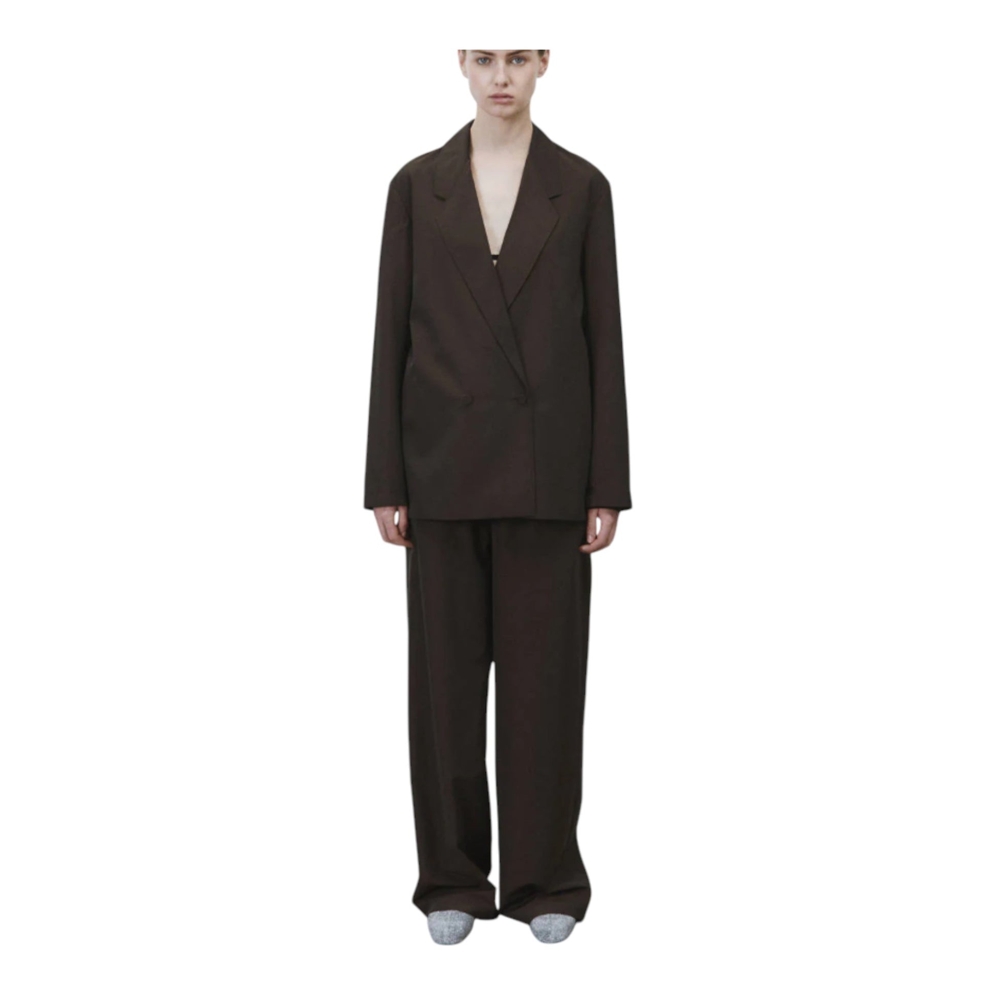 ウールをブレンドした特殊な生地は、光の角度によって表情を変える上品な光沢感と、深みのあるチョコレート色が魅力です。クラシックなノッチドラペルと、共布のボタンを使用したダブルブレストデザインが、洗練された印象を与えます。