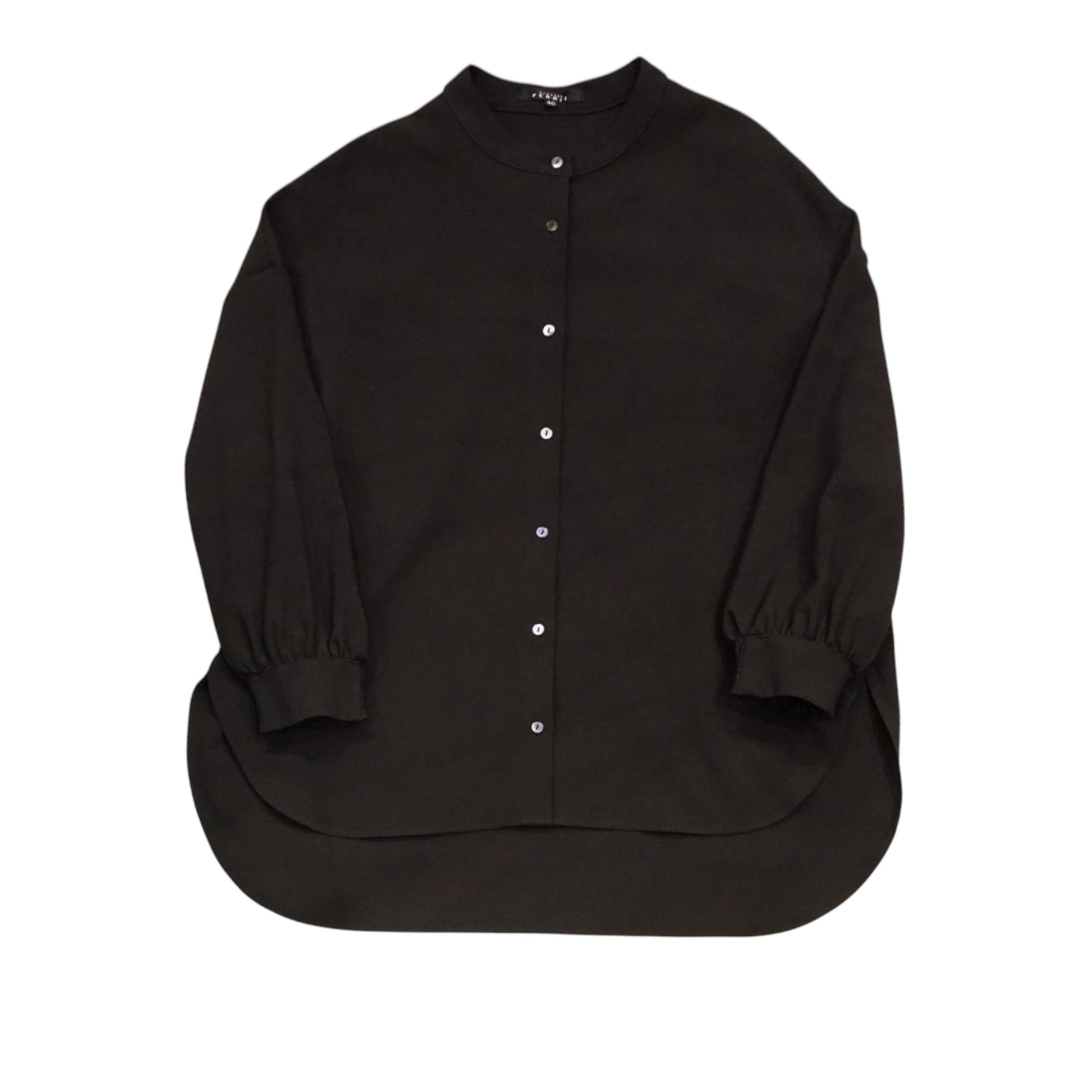 フロントはボタンで開閉でき、丸みを帯びたヘムラインが柔らかな印象を与えます。袖口にはギャザーが施され、伸縮性があるので、腕まくりもしやすく快適です。