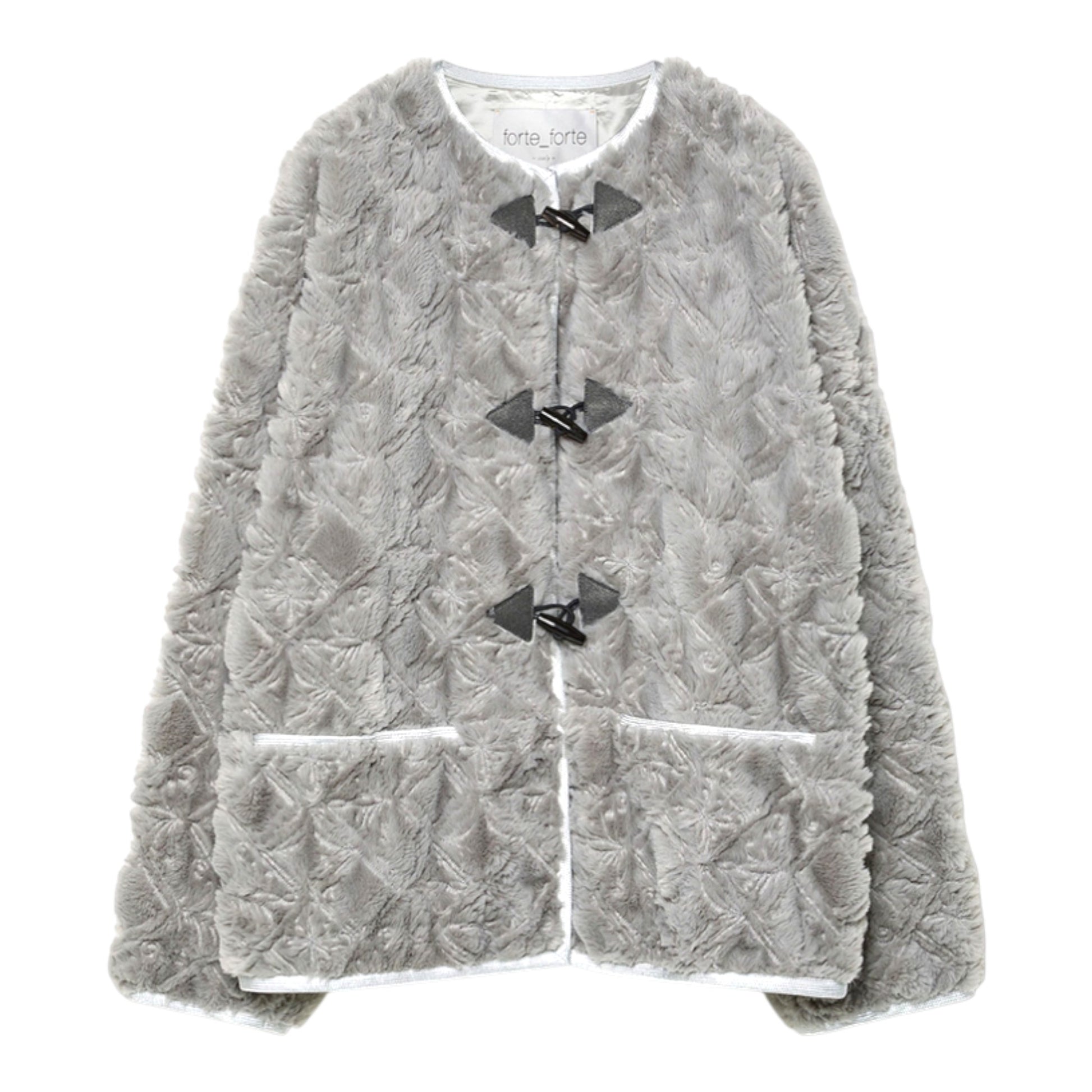 このコートは、心地よい肌触りのエコファーを贅沢に使用。柔らかな手触りで、あなたを優しく包み込みます。表面には、繊細な幾何学模様の刺繍が施されており、光沢のある艶やかなエコファーが、華やかなアクセントになっています。