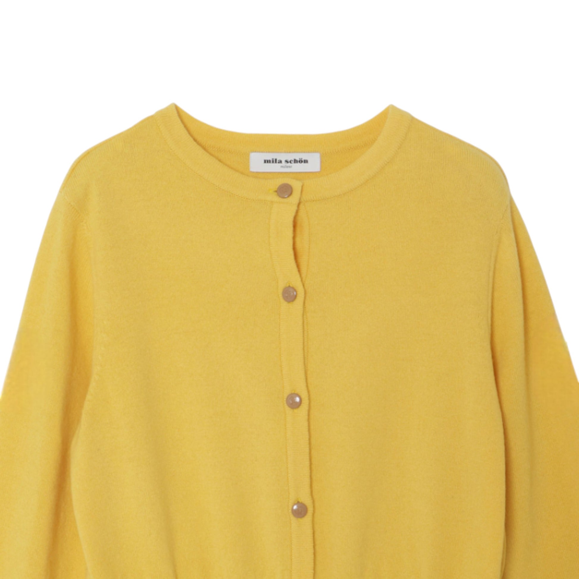 暖かみのあるイエローのニットと、上品なキャメルのタフタスカートの組み合わせ。華やかさとエレガントさを兼ね備えた、主役級のカラー。