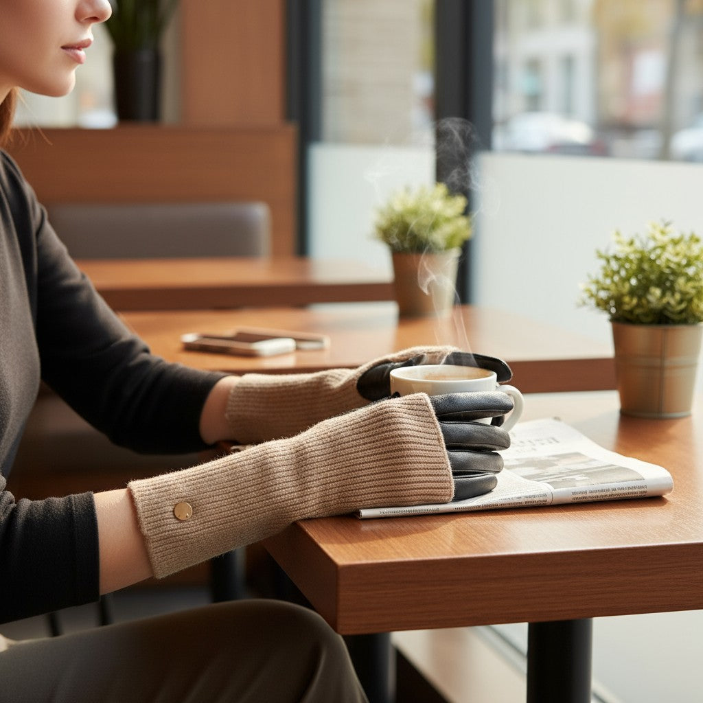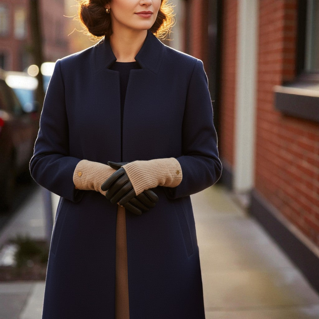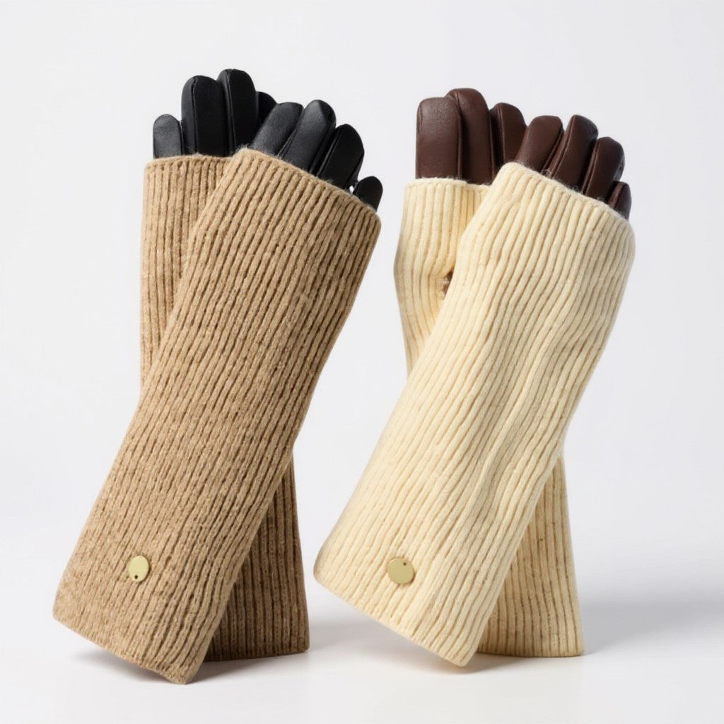 1. 【完全防寒スタイル】 ラムレザー本体 + リブニットカバー:最も暖かく、見た目も素敵な組み合わせ。指先までしっかりと防寒しつつ、ニットの配色がデザインのアクセントになります。