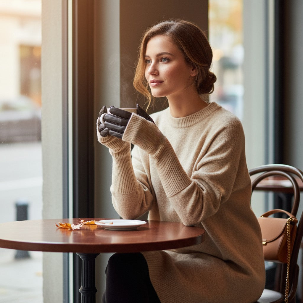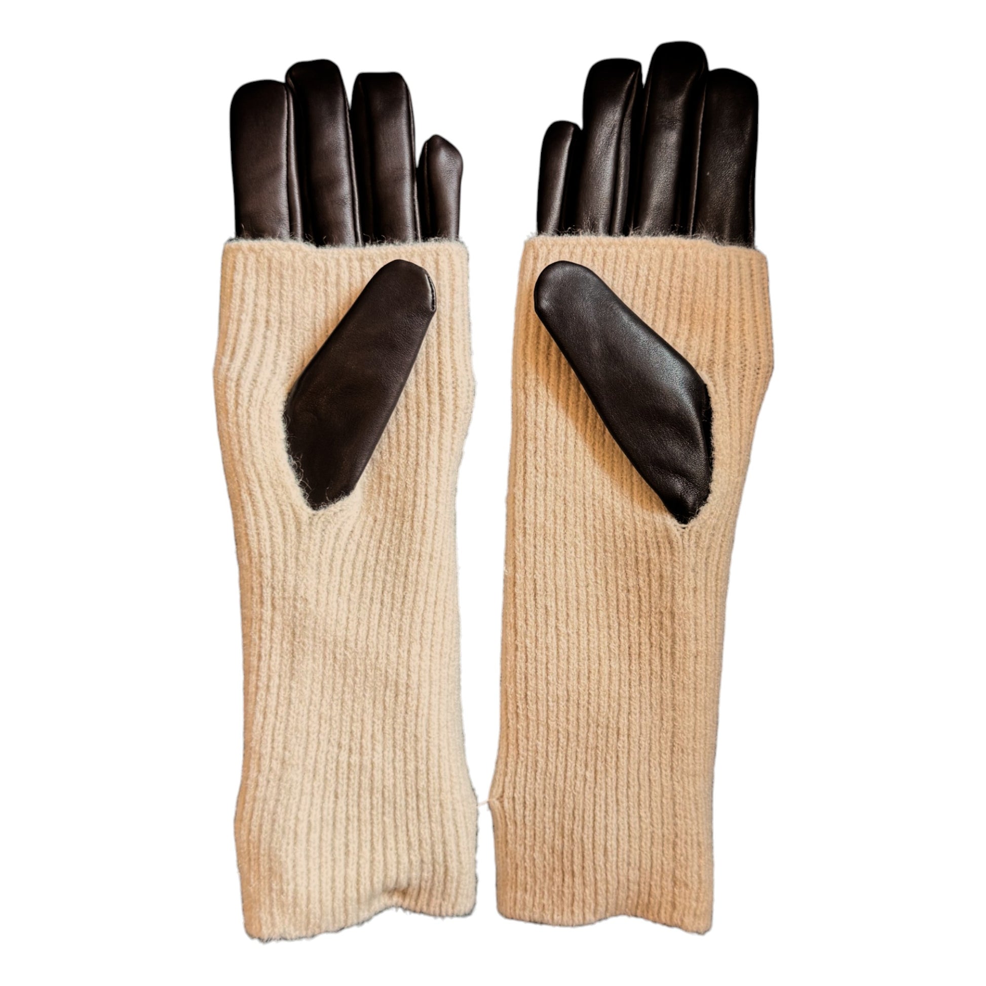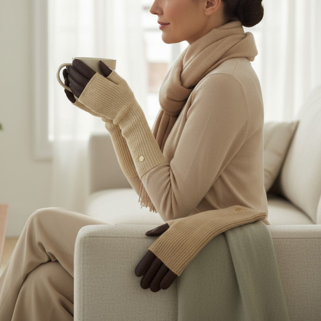 1. 【完全防寒スタイル】 ラムレザー本体 + リブニットカバー:最も暖かく、見た目も素敵な組み合わせ。指先までしっかりと防寒しつつ、ニットの配色がデザインのアクセントになります。