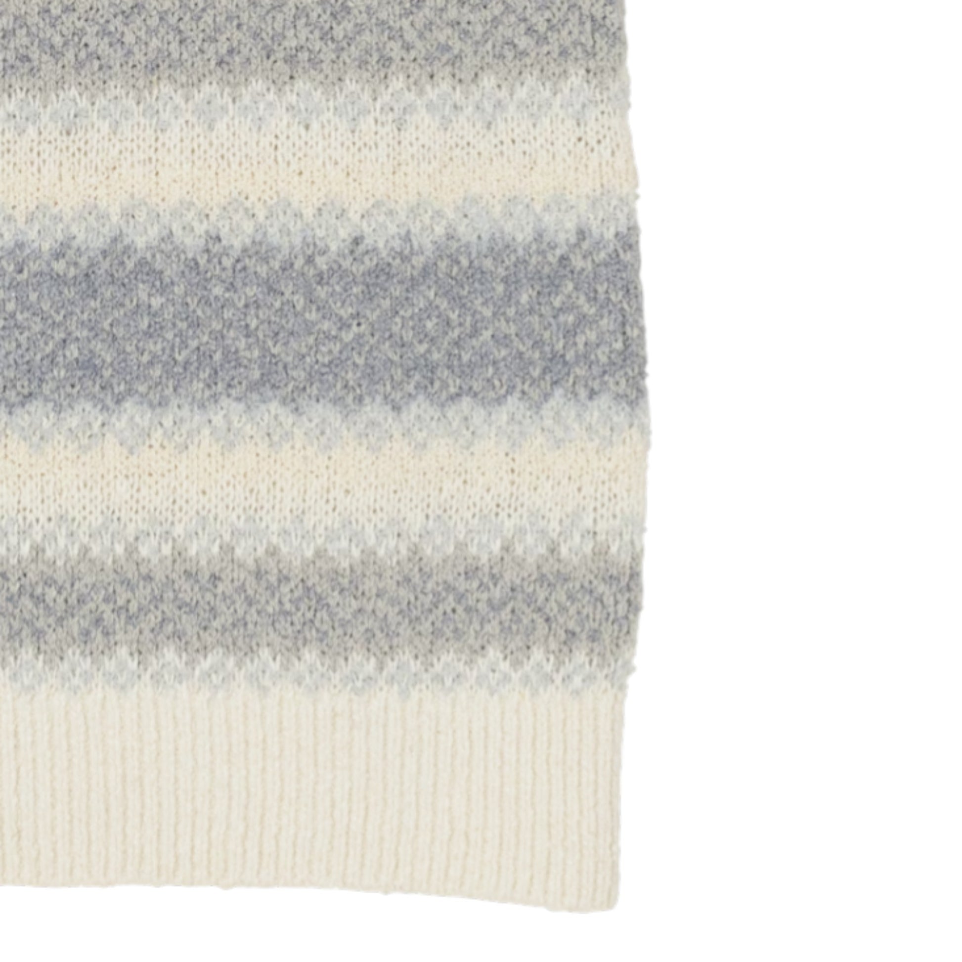ホワイトをベースに、淡いライトグレーとライトブルーを繊細に交差させた配色は、春の光を透過させたような清涼感に満ちています。クラシックなニットが持つ温もりを残しながら、素材と色使いで「今」の空気感を吹き込んだ、大人のワードローブにレトロな遊び心を添える逸品です。