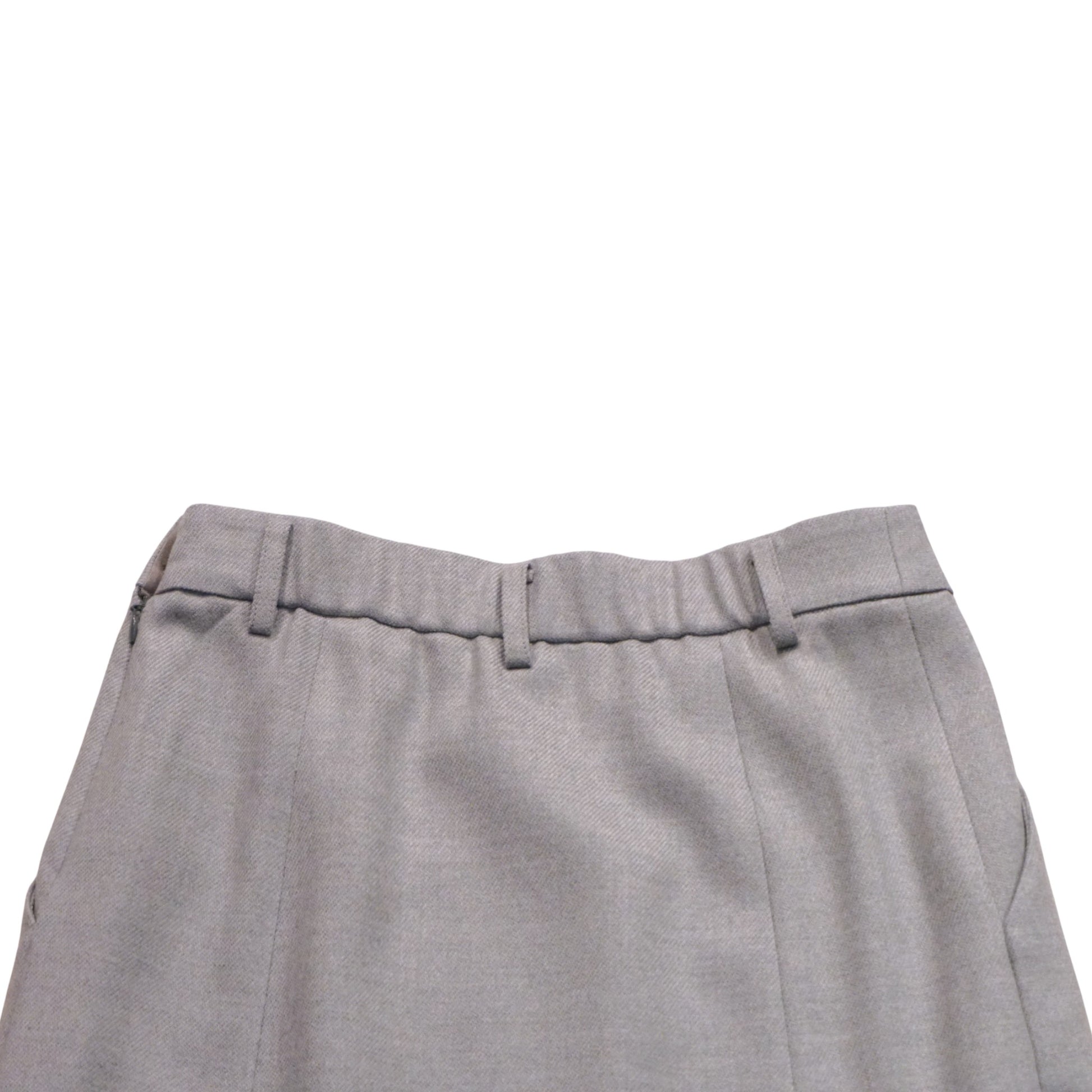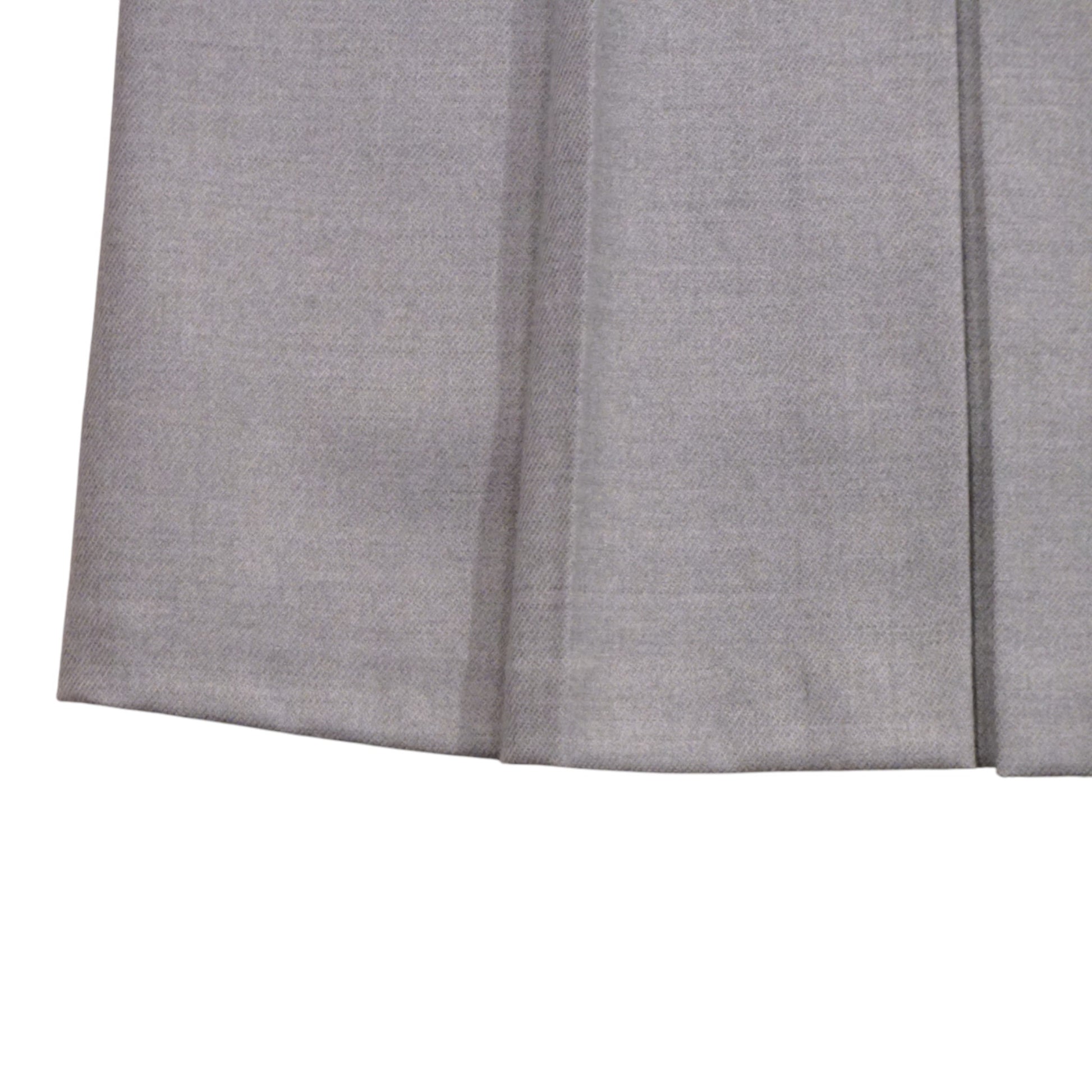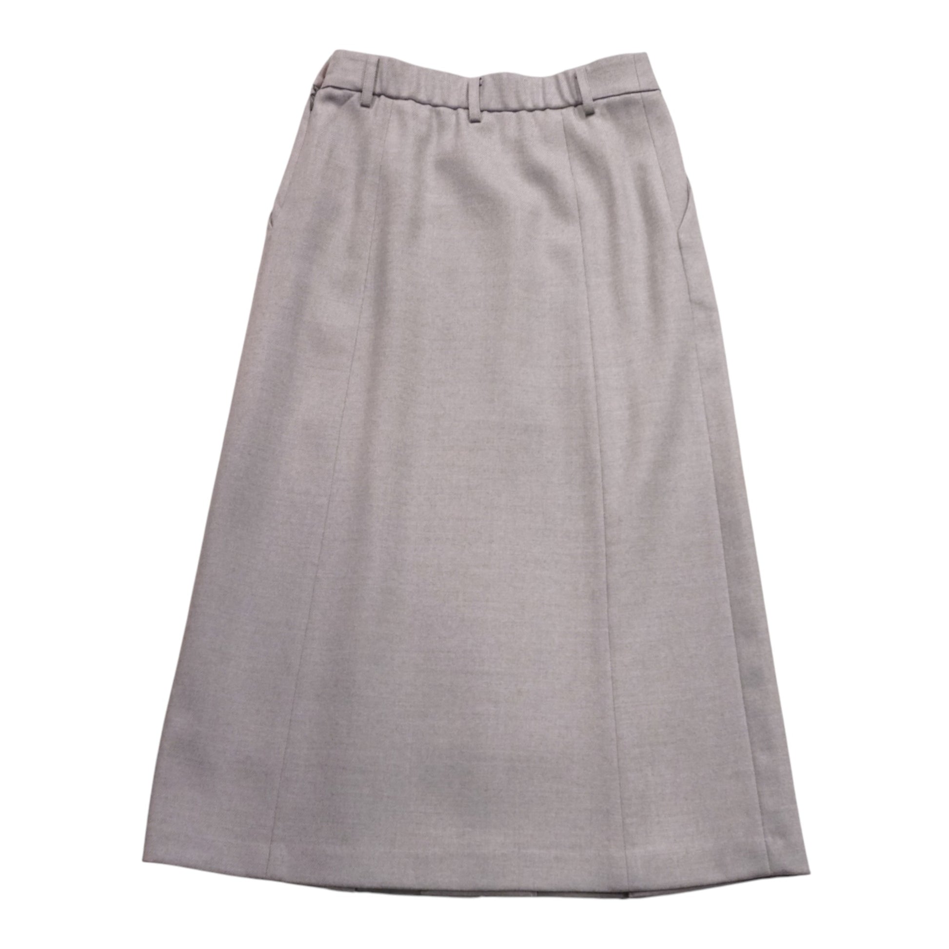 このスカートの最大の特長は、前身頃だけにボックスプリーツを施している点です。これにより、腰回りのボリュームを抑え、後姿もスッキリとした美しいラインをキープします。