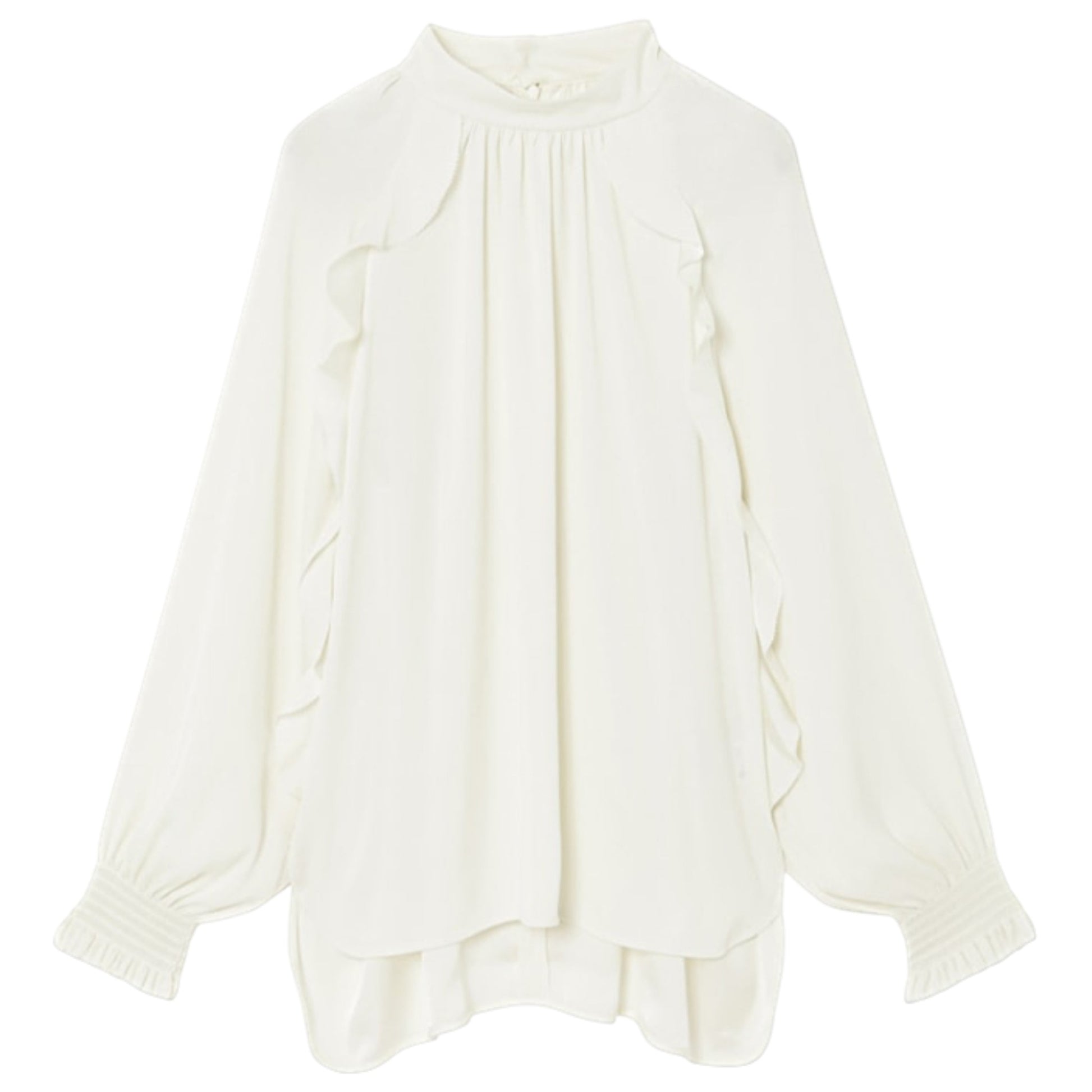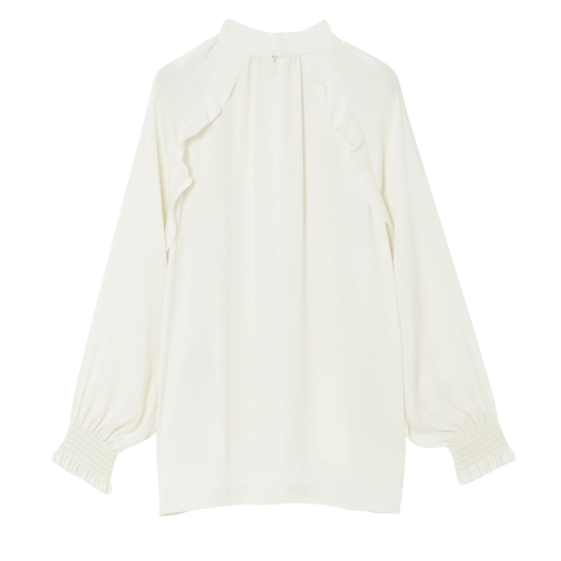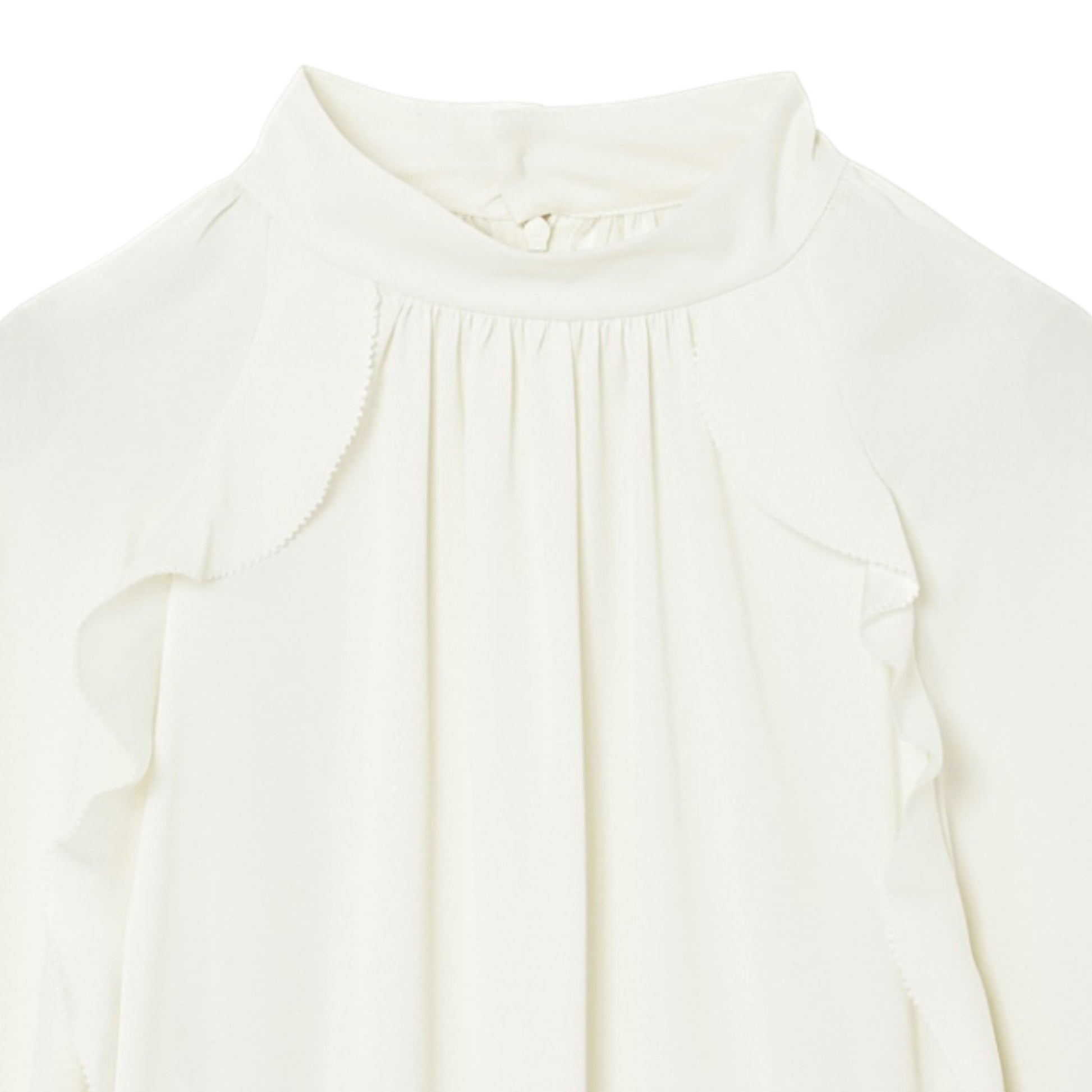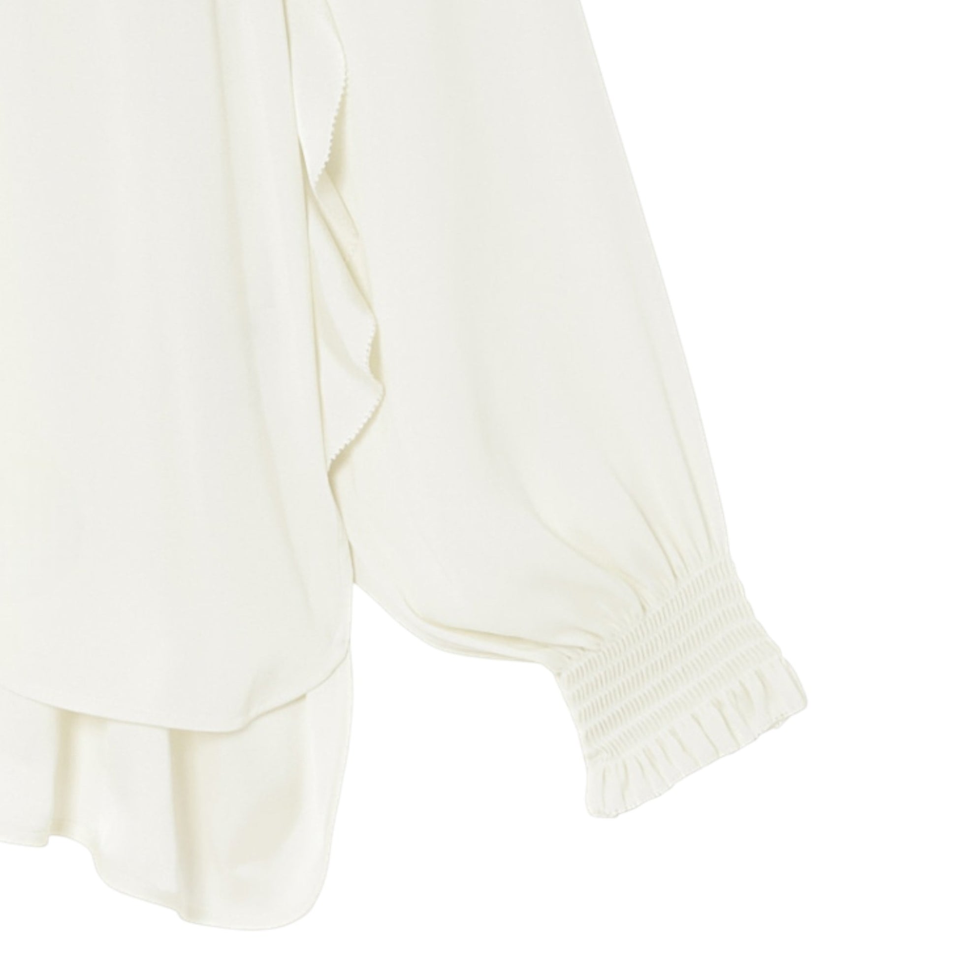 デザインの主役は、ネックラインを彩る繊細なラッフル(フリル)ディテール。華やかでありながらも主張しすぎず、洗練された大人のフェミニンさを演出します。袖口は伸縮性のあるカフスで、ブラウジングした際のシルエットも美しいです。
