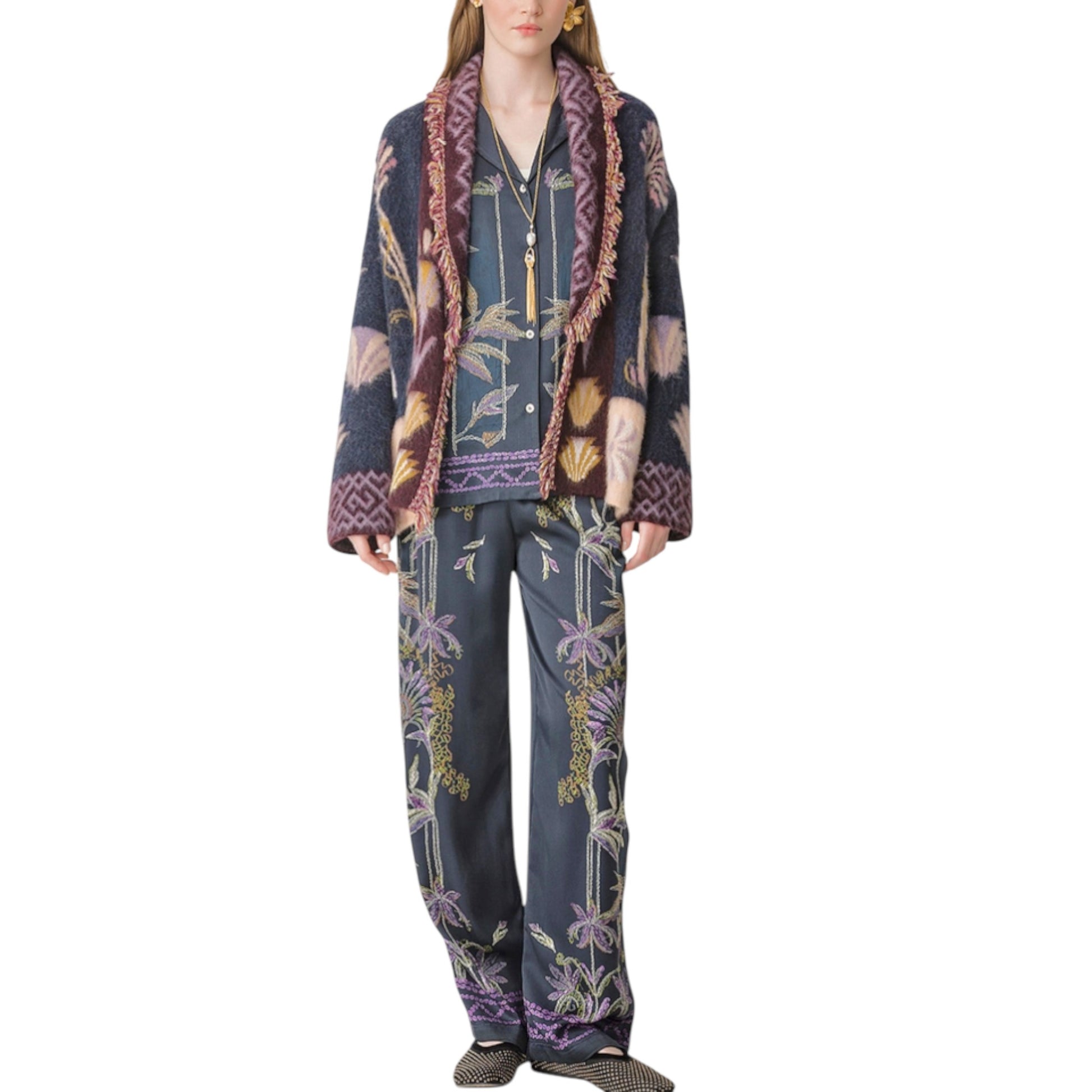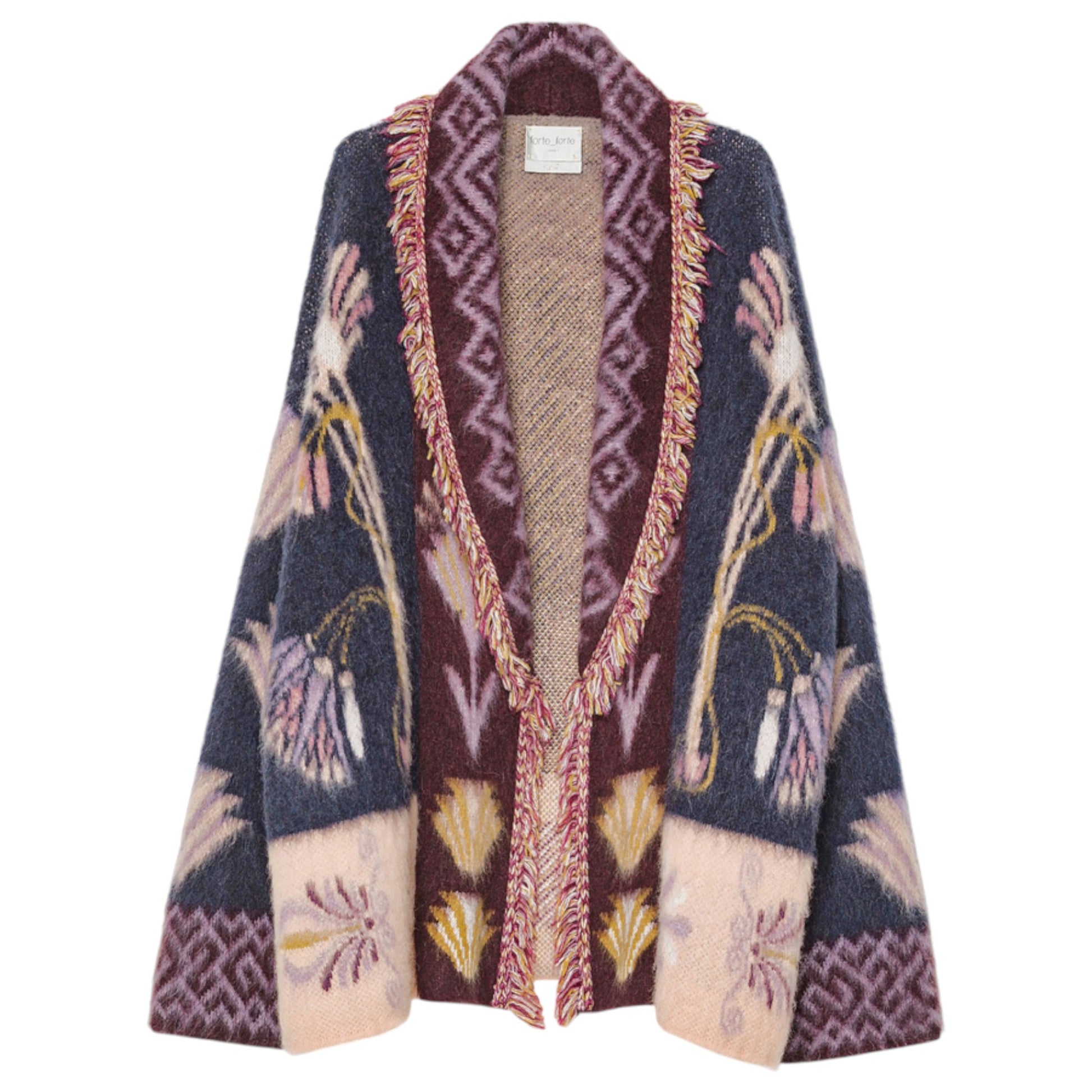 特徴: ショールカラー、フリンジ装飾、フローラル&グラフィックモチーフのコンパクトニット、ドロップショルダー、サイドポケット、Made in Italy