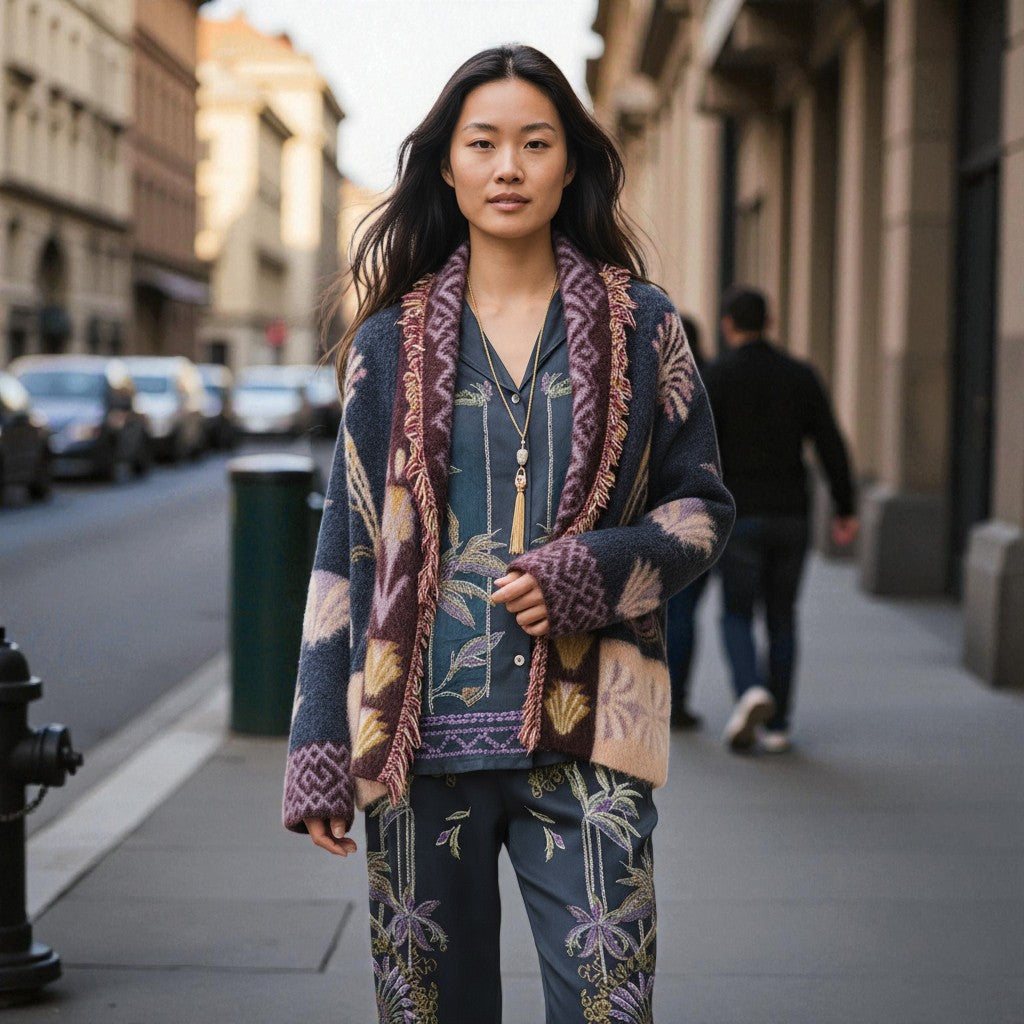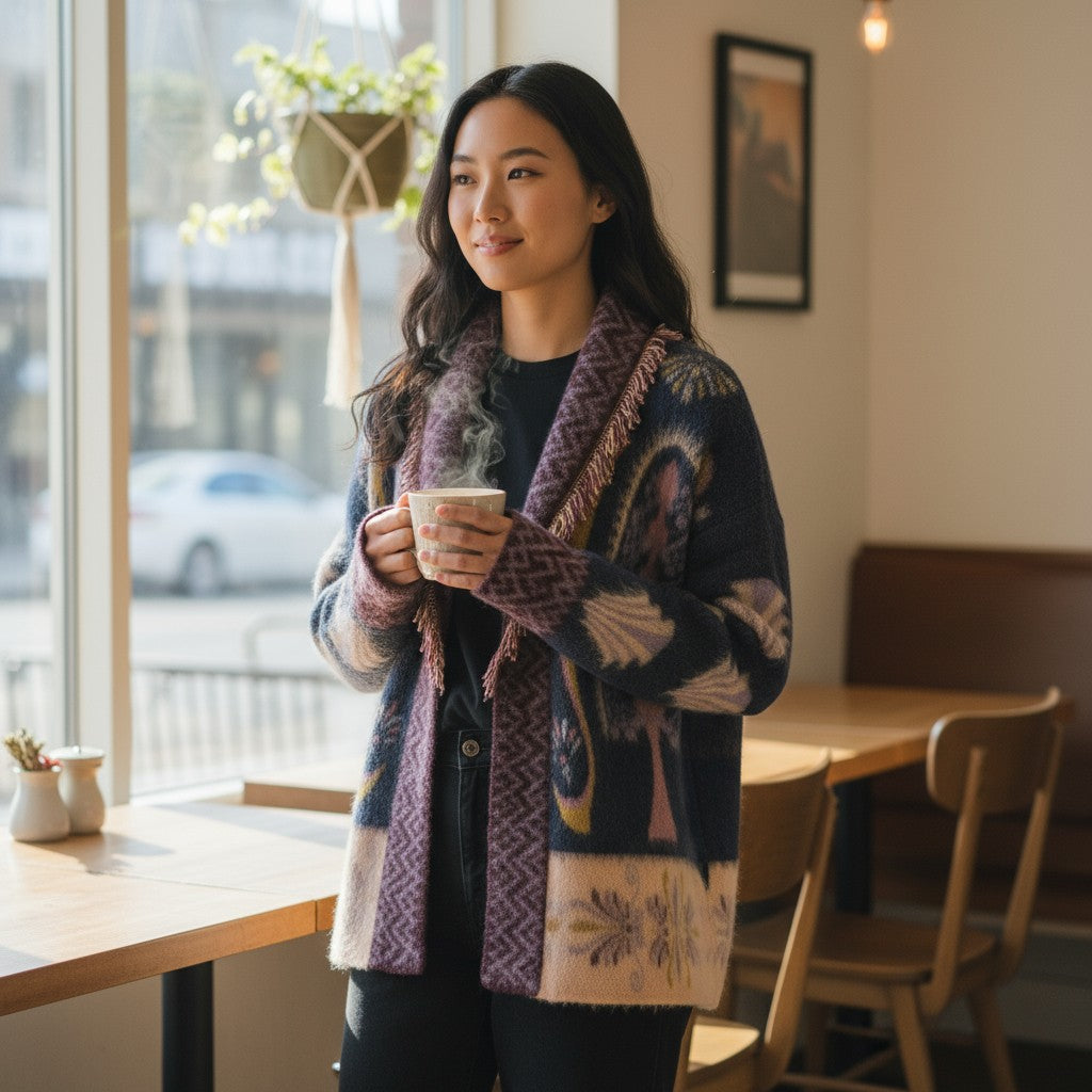 ショールカラーとフリンジ: ショール襟にはウールケーブル編みが施され、それが優雅なフリンジへと変化。この動きのあるディテールが、コージーながらも洗練されたキャラクターを際立たせます。
