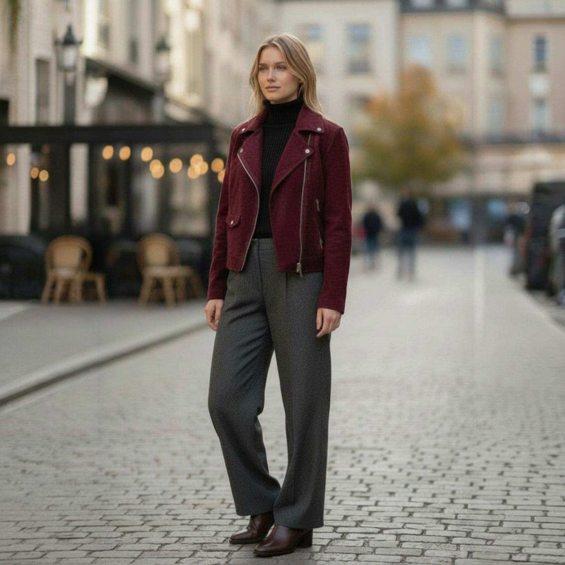 デニム生地がベースとは思えないほど滑らかで上質な手触りを実現。別珍特有の微かな光沢が、深みのある**バーガンディ(Burgundy)**の色彩を一層際立たせ、カジュアルなライダースをエレガントな装いへと昇華させます。